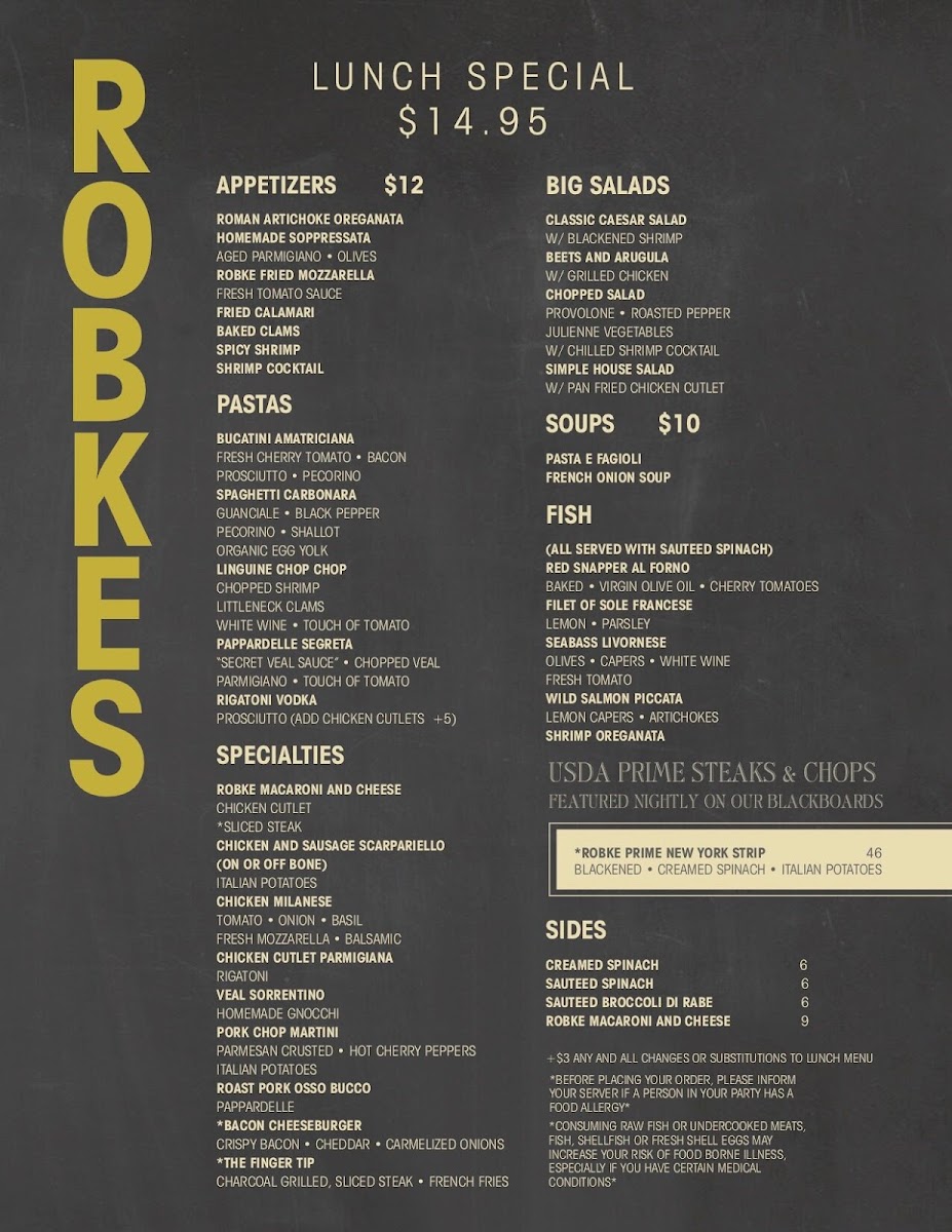 The menu is a delightful exploration of Italian flavors, with dishes that tantalize your taste buds and leave you craving more. Start your meal with one of their comforting soups, like the hearty Pasta e Fagioli or the rich French Onion Soup, both priced at just $10.00. The seafood selection dazzles with the Red Snapper al Forno, elegantly baked with virgin olive oil and cherry tomatoes for $14.95, or indulge in the Seabass Livornese, a melt-in-your-mouth treat prepared with olives, capers, white wine, and fresh tomatoes. For steak aficionados, the Robke Prime New York Strip, featuring blackened seasoning, creamed spinach, and Italian potatoes, is a showstopper at $46.00, showcasing the restaurant’s commitment to quality ingredients and bold flavors.